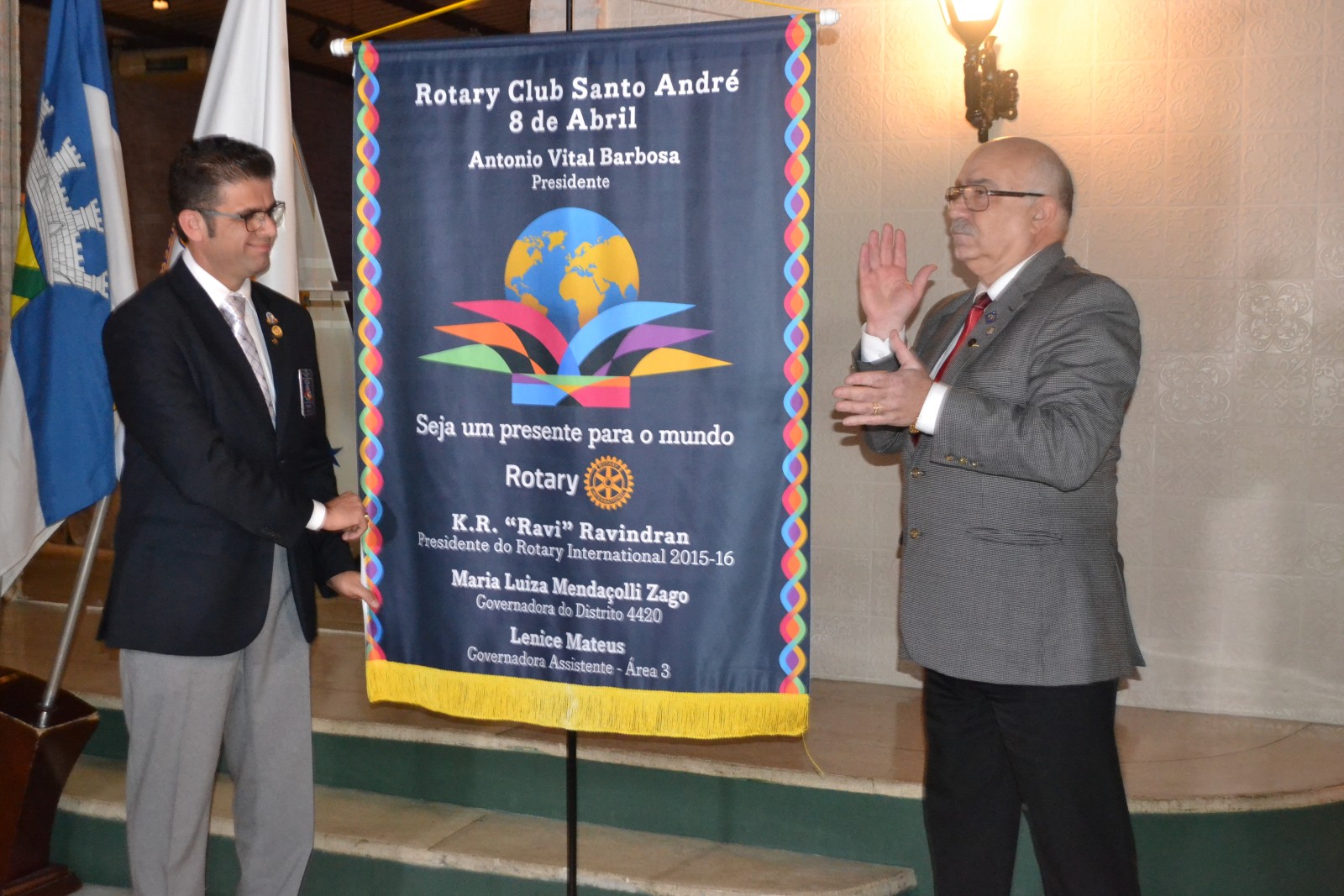 Mais uma festiva de Transmissão e Posse conjunta reuniu dois clubes do Distrito 4420! Os companheiros dos Rotary Clubes de Santo André Oito de Abril e Santo André Sul, receberam seus convidados de forma brilhante, para celebrar o ano rotário presente.