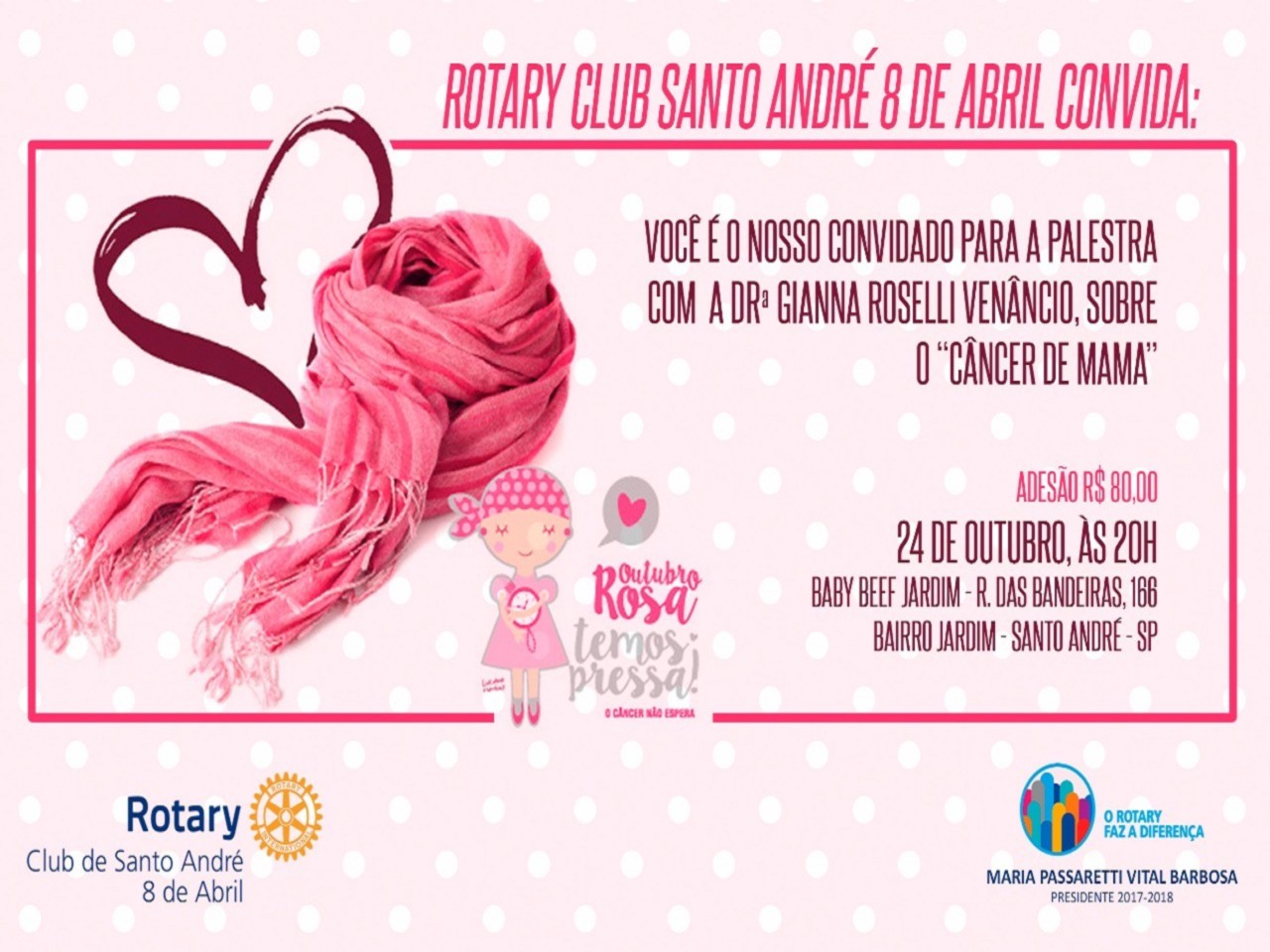 O Rotary Club de Santo André 8 de Abril convida para assistir a palestra O câncer de mama que será proferida pela Dra. Gianna Roselli Venâncio. Dia 24 de outubro. 20h. Baby Beef Jardins. Santo André. Adesões R$ 80,00