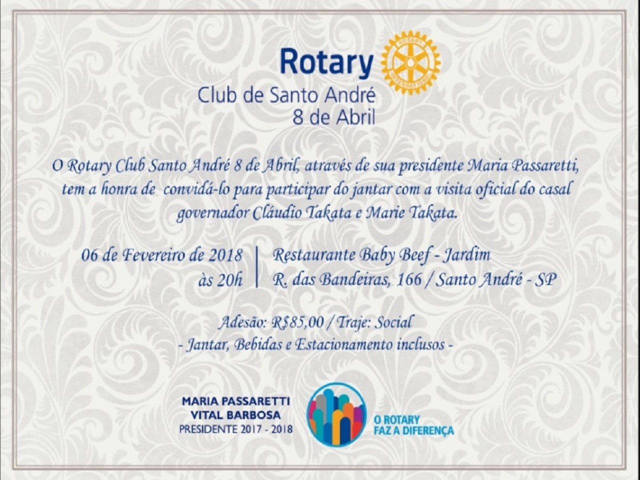 O Rotary Club Santo André 8 de Abril, através de sua presidente Maria Passaretti, tem a honra de convida-lo para participar do jantar com a visita oficial do casal governador Claudio Takata e Marie Takata