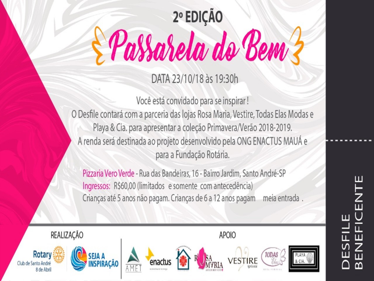 Como ocorreu em 2017, a Passarela do Bem será realizada na Pizzaria Vero Verde, localizada na rua das Bandeiras, 16 ? Bairro Jardim ? Santo André.